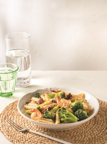 Πέννες με μπρόκολο, γαρίδες, κουκουνάρι και λιαστές ντομάτες