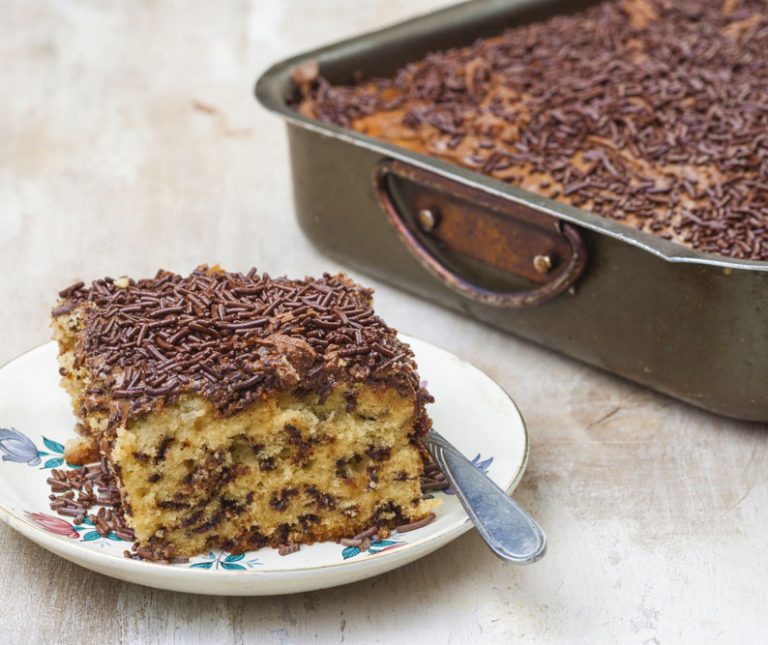 Αδειάζουμε το μείγμα για κέικ και ψήνουμε σε καλά προθερμασμένο φούρνο, στις αντιστάσεις, κάτω σχάρα, στους 170ºC για περίπου 1 ώρα μέχρι να φουσκώσει, να ροδίσει και να βγαίνει στεγνή η λάμα του μαχαιριού.
