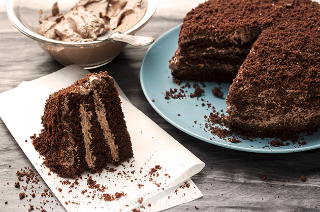 Βάζουμε ένα παντεσπάνι σε τουρτιέρα και αν θέλουμε βρέχουμε με λίγο λικέρ. Απλώνουμε λεπτή στρώση κρέμα σοκολάτας. Επαναλαμβάνουμε παντεσπάνι – κρέμα και τελειώνουμε, αλείφοντας όλη τη τούρτα με κρέμα σοκολάτας.