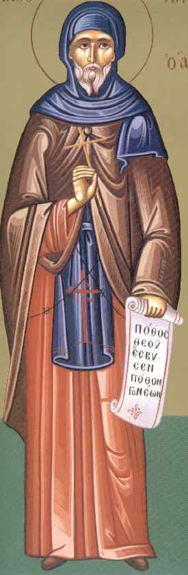 Παρθένος τῷ σώματι σὺ ἀναδέδειξαι, πιστῶς τῷ ποιήσαντι, σὺ πεφανέρωσαι, Πατὴρ ἡμῶν Ὅσιε· ὅθεν καὶ συνευφραίνῃ, ταῖς φρονίμοις Παρθένοις, πίστει δὲ συγχορεύεις, τοῖς ὁσίοις Πατράσιν, ἡμῖν δὲ ἐπεφάνης βρύων τὰ θαύματα.