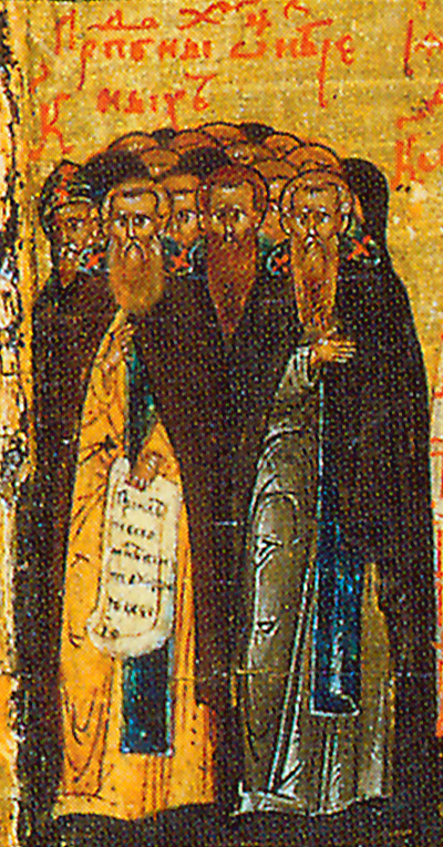 Δι' ἐγκρατείας τῶν παθῶν τὰς πυριφλέκτους, ἀπονεκρώσαντες ὁρμάς, καὶ τὰς κινήσεις, Ἀσκηταὶ θεόληπτοι, ἑπόμενοι κατ' ἴχνος, τῷ πάντα τεκτηναμένῳ μόνῳ Θεῷ, καθάπερ δεκτὴ θυσία καὶ ἱερά, προσηνέχθητε σφάγια, διὰ χειρὸς βαρβαρικῆς, τυπτόμενοι σφαττόμενοι, καὶ βιαίως κοπτόμενοι.