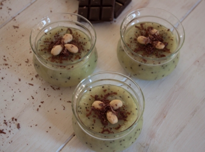Μόλις χλιάνει μοιράζουμε σε μπολάκια και πασπαλίζουμε με τη τριμμένη κουβερτούρα και τα αμύγδαλα.