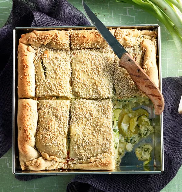 Κόβουμε την πίτα σε μερίδες και την ψήνουμε στον φούρνο για 1 ώρα και 30 λεπτά στον αέρα. Αν χρειαστεί, ανάβουμε τις κάτω αντιστάσεις του φούρνου και συνεχίζουμε το ψήσιμο για 15 λεπτά ακόμα. Η πίτα τρώγεται σε θερμοκρασία δωματίου ή κρύα.