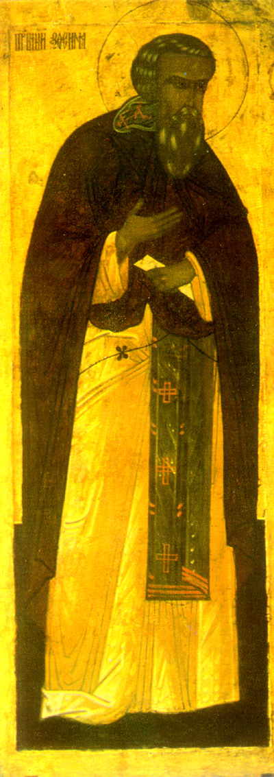Ο Όσιος Ζωσιμάς, ο μεγάλος ασκητής του Ρωσικού Βορρά, υπήρξε ηγούμενος και ιδρυτής του κοινοβιακού μοναχισμού στο νησί Σολόφκι. Γεννήθηκε στην επαρχία του Νόβγκοροντ, στο χωριό Τολβούι κοντά στη λίμνη Ονέγκα. Από τα παιδικά του χρόνια μεγάλωσε με ευσέβεια και μετά τον θάνατο των γονέων του, Γαβριήλ και Βαρβάρας, μοίρασε την περιουσία του και εκάρη μοναχός. Ο πόθος του να βρει ένα ερημικό μέρος για να μονάσει, τον οδήγησε στις ακτές της Λευκής Θάλασσας και στο Δέλτα του ποταμού Σουμ. Εκεί συνάντησε τον Άγιο Γερμανό (τιμάται 30 Ιουλίου), ο οποίος του είπε για ένα ερημικό νησί, όπου είχε περάσει έξι χρόνια μαζί με τον Άγιο Σαββάτιο (τιμάται 27 Σεπτεμβρίου).