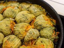 Αφαιρούμε τα κοτσανάκια από τους ανθούς, τους πλένουμε και τους αφήνουμε σε τρυπητό για να στραγγίξουν. Τσιγαρίζουμε στο λάδι τα κρεμμυδάκια και μετά ρίχνουμε τον άνηθο, τον μαϊντανό, το ρύζι και ανάλογο νερό. Ανακατεύουμε σε μέτρια φωτιά για 8 λεπτά. Κατεβάζουμε το ρύζι από τη φωτιά και ρίχνουμε λεμόνι. Γεμίζουμε τους ανθούς μ'αυτό το μείγμα ως τη μέση και τους κλείνουμε προσεκτικά, διπλώνοντας τις άκρες σταυρωτά. Τους βάζουμε σε ρηχή κατσαρόλα, προσθέτουμε λίγο λάδι, λεμόνι και λίγο νερό. Τους σιγοβράζουμε σκεπασμένους για 15 λεπτά περίπου.