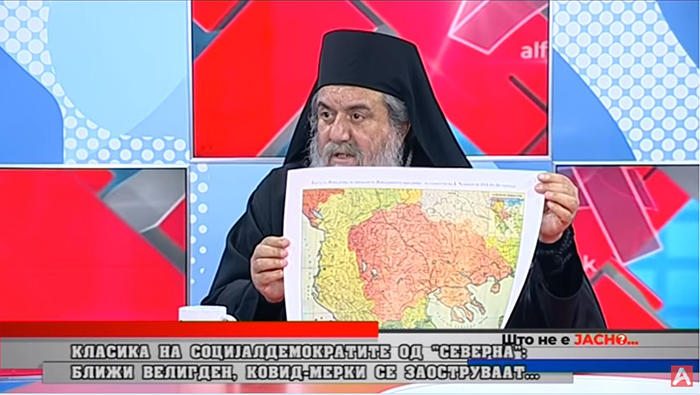 Ὁ σκοπιανὸς «Ἐπίσκοπος» Βελεσῶν ἐπιδεικνύων εἰς τηλεοπτικὴν ἐκπομπήν τὸν χάρτην τῆς Μεγάλης Μακεδονίας (10.3.2021)! Καίτοι τὰ τεκμήρια αὐτὰ κατετέθησαν εἰς τὴν Σύνοδον τοῦ Φαναρίου, ὁ Πατριάρχης Βαρθολομαῖος ἀκολουθεῖ τὸ δόγμα “σκασίλα μου”…