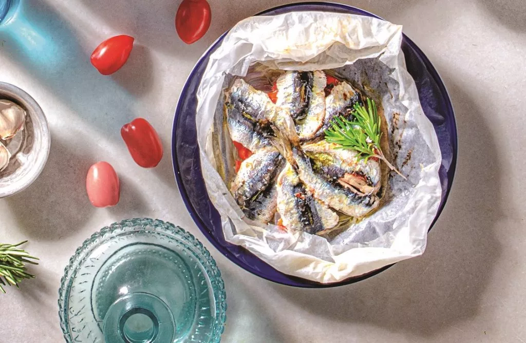 Αλατίζουμε ελαφρώς και πασπαλίζουμε με το δεντρολίβανο. Στρώνουμε σε κύκλο ακτινωτά τις σαρδέλες με το δέρμα προς τα πάνω και τις ουρές προς το κέντρο. Σκεπάζουμε με τη λαδόκολλα σαν καπάκι και κάνουμε 3-4 μικρά σφιχτά διπλώματα του 1 εκ. στα πλαϊνά. Από την τελευταία ανοιχτή πλευρά κάνουμε 3-4 διπλώματα ώστε να κλείσει αεροστεγώς και σφραγίζουμε τις δύο γωνίες με ένα συρραπτικό.