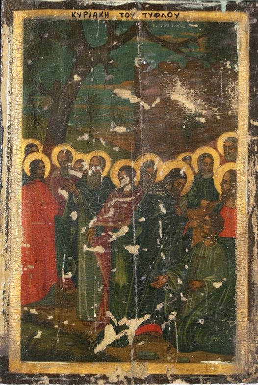 Όπως διαβάζουμε στο Κατά Ιωάννη Ευαγγέλιο (κεφ. 9, 1-38), ο Χριστός, περνώντας μέσα από την Ιερουσαλήμ, συναντάει έναν εκ γενετής τυφλό. Ο Κύριος, έκανε πυλό, αφού έφτυσε στο χώμα, του άλειψε τα μάτια και τον έστειλε στην κολυμβήθρα του Σιλωάμ. Ο τρόπος αυτός θεραπείας, μας υπενθυμίζει τον τρόπο που ο Θεός δημιούργησε τον άνθρωπο, πλάθοντάς τον. Ο Θεός στην Παλαιά Διαθήκη, πλάθει τον άνθρωπο από χώμα, τώρα ο Χριστός, πλάθει τα μάτια του εκ γενετής τυφλού πάλι από χώμα. Ο ίδιος Θεός! Δοκιμάζει την πίστη του τυφλού και τον στέλνει στην κολυμβήθρα του Σιλωάμ. Σέβεται την ελευθερία του ανθρώπου, και ζητάει τη δική του εκούσια και ελεύθερη συμμετοχή του στο θαύμα. Ο τυφλός όμως με πίστη, υπακούει στην εντολή του Θεού, πηγαίνει και πλένεται και επιστρέφει βλέποντας.