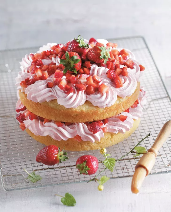 Τοποθετούμε το πρώτο ραβανί σε πιατέλα και από πάνω κάνετε μια γενναία στρώση με ροζ σαντιγί και μετά με φράουλες κομμένες σε κυβάκια. Σκεπάζουμε με το δεύτερο ραβανί και τελειώνουμε με ροζ σαντιγί και κυβάκια φράουλας. Ολοκληρώνουμε τη διακόσμηση με μισές και ολόκληρες φράουλες και φυλλαράκια δυόσμου και είναι έτοιμη για σερβίρισμα.