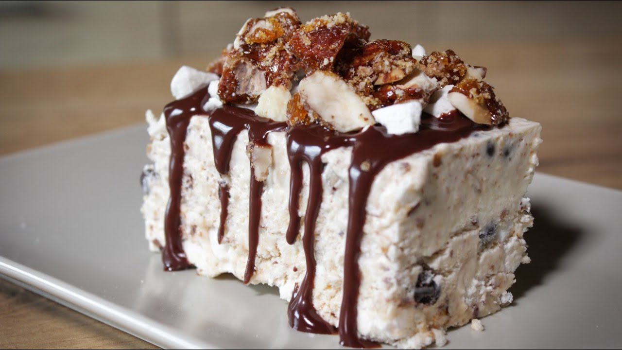 Βγάζετε τη φόρμα από την κατάψυξη, την ανοίγετε και ξεφορμάρετε το παγωτό. Λίγο πριν το σερβίρισμα το περιχύνετε με τη χλιαρή σάλτσα σοκολάτας που έχετε ετοιμάσει.