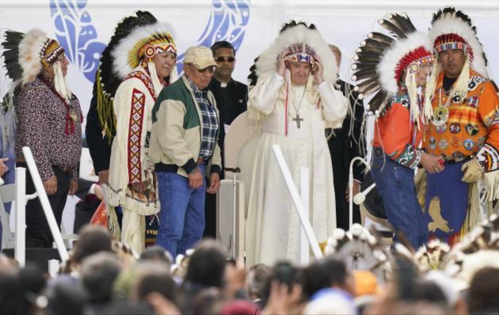 Ο Πάπας Φραγκίσκος επισκέφθηκε τον Καναδά πριν από λίγες ημέρες και φόρεσε παραδοσιακά φτερά ηγετών αυτοχθόνων πληθυσμών (ινδιάνων) της εν λόγω χώρας. Επίσης φίλησε συμβολικά το χέρι ενός των ηγετών τους. Έτσι εξέφρασε τη μετάνοια και τη συγγνώμη των Ρωμαιοκαθολικών για τα εγκλήματα που τέλεσαν μισιονάριοι του Βατικανού σε βάρος ομοεθνών τους από το 1831 έως το 1996.