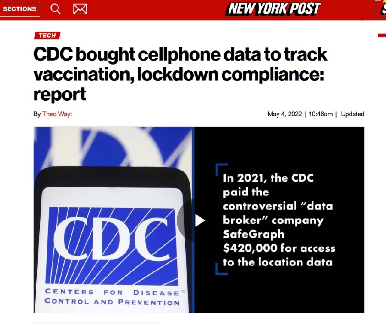 Ένας αμφιλεγόμενος «μεσίτης δεδομένων» που ονομάζεται SafeGraph παρείχε αρχικά τα δεδομένα στο CDC δωρεάν κατά τη διάρκεια της εκδήλωσης της πανδημίας, δείχνουν τα έγγραφα. Στη συνέχεια, το 2021, το CDC φέρεται να συνήψε συμφωνία για να πληρώσει στην εταιρεία 420.000 δολάρια για συνεχή πρόσβαση.