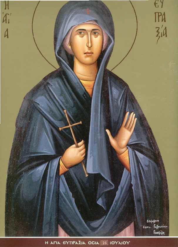 Η δε κόρη της Ευπραξία, μοίρασε τα χρήματα αυτά στις εκκλησίες και στους φτωχούς και επιδόθηκε σε αυστηρότατη άσκηση για 45 ολόκληρα χρόνια. Έτσι ασκητικά και άγια αφού έζησε, παρέδωσε ειρηνικά το πνεύμα της στον Θεό, επιτελώντας πολλά θαύματα.