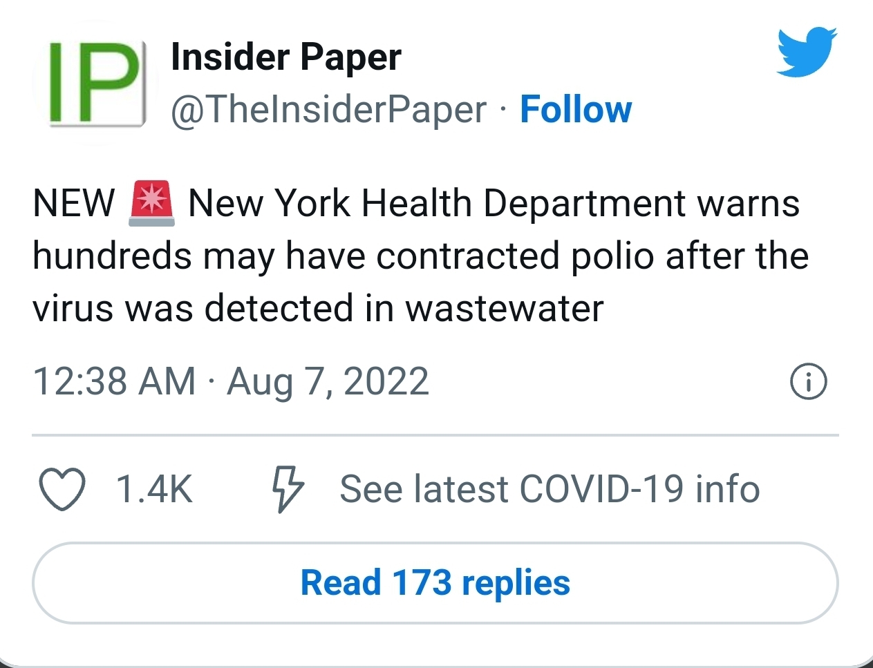 NEW New York Health Department warns hundreds may have contracted polio after the virus was detected in wastewater — Insider Paper (@TheInsiderPaper) August 6, 2022