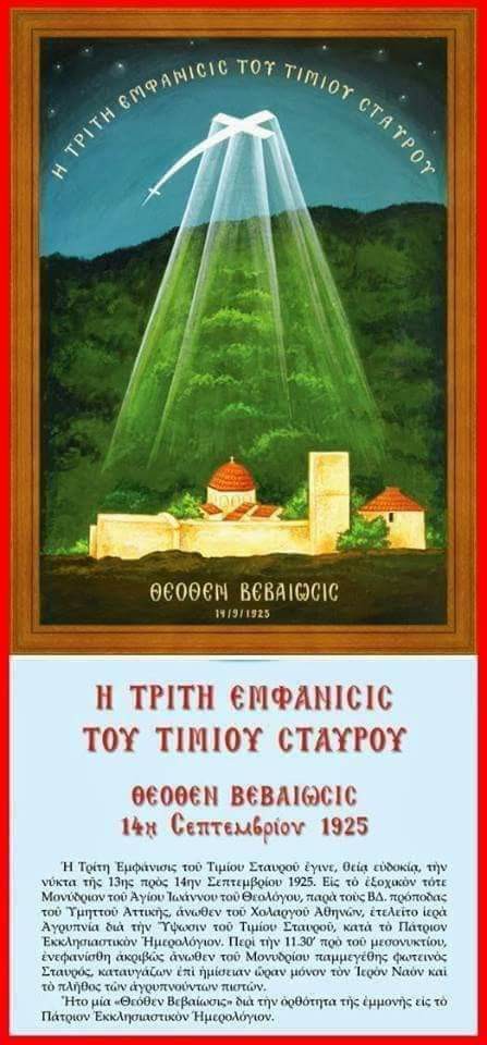 Ήταν σαν απόψε, 95 χρόνια πριν, ώρα 23:30, 13 προς 14 Σεπτεμβρίου 1925 (26 προς 27 με το νέο ημερολόγιο), όταν έγινε η Τρίτη Εμφάνιση του Τιμίου Σταυρού στον Άγ. Ιωάννη τον Θεολόγο στον Υμηττό (Παπάγου).