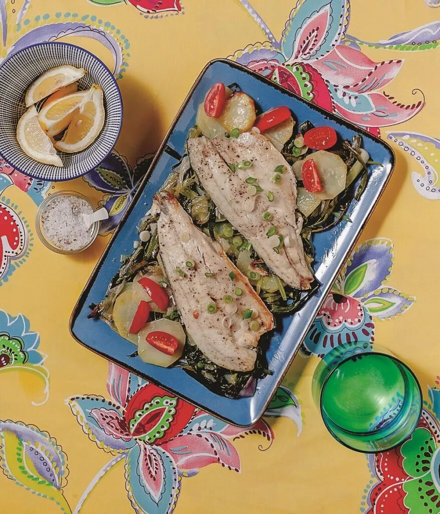 Λαβράκι με φρέσκα κρεμμυδάκια στον φούρνο