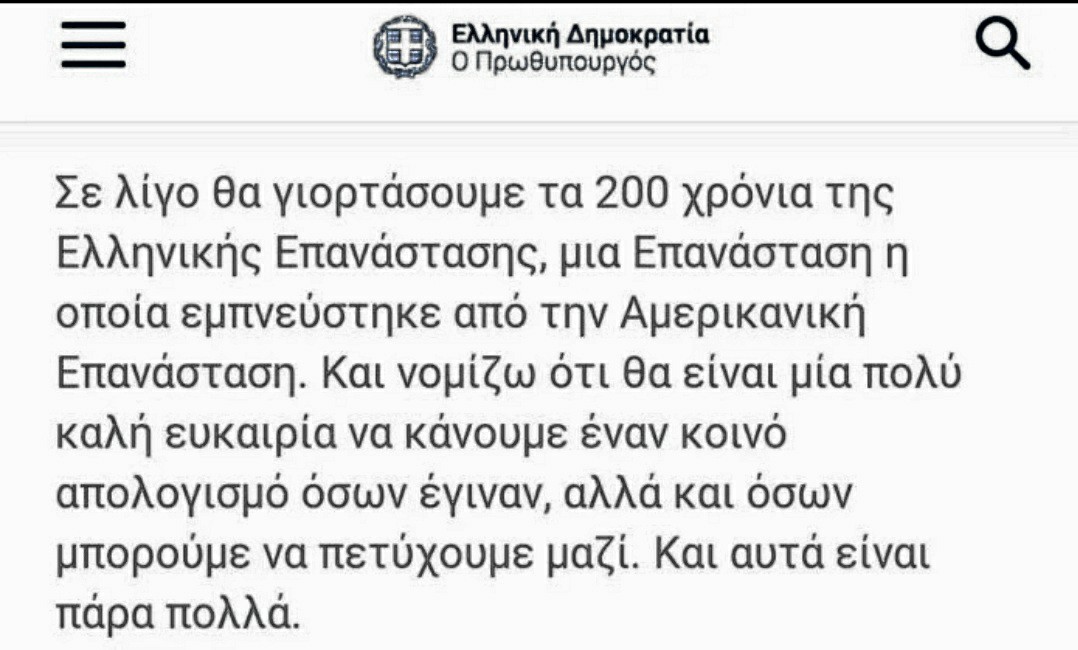 Ὁ κύριος Μητσοτάκης εἶπε συγκεκριμένα: «Σὲ λίγο θὰ γιορτάσουμε τὰ 200 χρόνια της ἑλληνικῆς ἐπανάστασης, μία ἐπανάσταση ἡ ὁποία ἐμπνεύστηκε ἀπὸ τὴν ἀμερικανικὴ ἐπανάσταση καὶ νομίζω ὅτι θὰ εἶναι μία πολὺ καλὴ εὐκαιρία νὰ κάνουμε ἕνα κοινὸ ἀπολογισμὸ ὅσων ἔγιναν ἀλλὰ καὶ ὅσων μποροῦμε νὰ... πετύχουμε μαζὶ καὶ αὐτὰ εἶναι πολλά»!