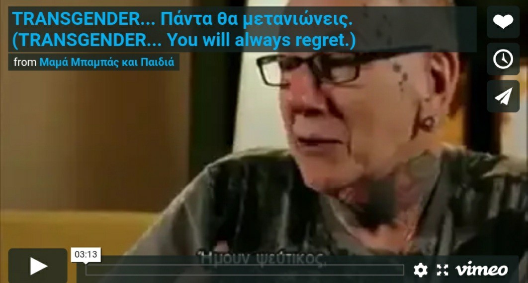 Αὐτή εἶναι μία σπουδαία μαρτυρία καί θέλω νά βοηθήσω καί κάποιον ἄλλο πρίν κάνει τό ἴδιο λάθος πού ἔκανα ἐγώ. Σέ ὅλους αὐτούς μέ τούς ὁποίους συζητῶ καί πρόκειται νά προχωρήσουν σέ «ἀλλαγή φύλου», τούς λένε ...μπλά, μπλά, μπλά, …«ναί σέ αὐτά πού λές, ἔχεις δίκιο, προχώρα καί καν΄ το». «Ἄν αἰσθάνεσαι καλά μέ αὐτό, ἐάν εἶναι αὐτό πού θέλεις, προχώρα καί κάν΄ το.»