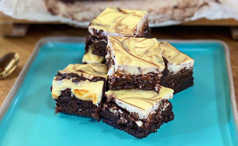 Mε ένα πιρούνι ή ένα μαχαίρι το διανέμουμε απαλά παντού κάνοντας βαθιές ραβδώσεις ώστε να μπλέξουμε το πάνω μείγμα τυριού με το κάτω μείγμα των μπράουνις.