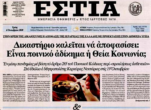 Αν υπό τις περιστάσεις της πανδημίας και υπό τον όρο της προστασίας της δημόσιας υγείας η Θεία Κοινωνία αποτελεί ποινικό αδίκημα της έκθεσης σε κίνδυνο. Στην πραγματικότητα τίθενται υπό την κρίση του δικαστηρίου κατ ουσίαν και οι αποφάσεις της Ιεραρχίας.