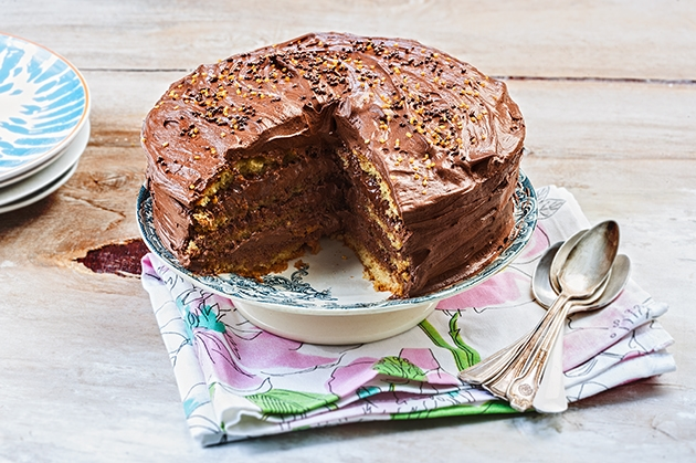 Αλείφουμε στρώση κρέμα – πραλίνα κάθε παντεσπάνι και αλείφουμε με ένα πινέλο γύρω γύρω την τούρτα.