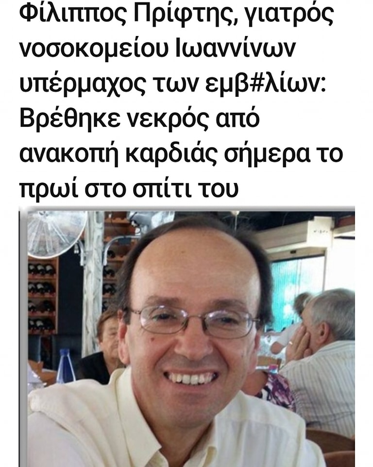 Νεκρός έπεσε ο γιατρός Φίλιππος Πρίφτης ο οποίος υπηρετούσε στο νοσοκομείο Ιωαννίνων για πάνω από 20 χρόνια και είχε δώσει όλο του το είναι ώστε να ανταπεξέλθει όπου τον χρειαζόταν και να συμπληρώνει τις ελλείψεις που είχε το νοσοκομείο.