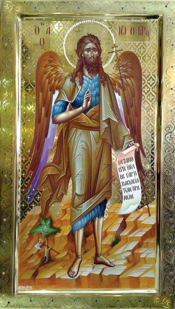 Αὐτός ὑπῆρξε καρπός θεϊκῆς ὑποσχέσεως, τό χαρμόσυνο ἄγγελμα τοῦ Γαβριήλ, τό τρυφερό κλωνάρι πού χαρίστηκε ἀπό τόν Θεό, στό ξεραμένο ἀπό τήν ἡλικία δέντρο. Τό καρπερό λουλούδι τῆς στείρας. Ὁ προφήτης πού εἶναι γιός προφήτη. Ὁ τρόφιμος τῆς ἐρήμου. Αὐτός πού ἑτοίμασε καί ἑτοιμάζει τούς ἀνθρώπους ὅλης τῆς οἰκουμένης στούς πνευματικούς ἀγῶνες καί στό καλοδέξιμο τοῦ Κυρίου. Ὁ λαμπερός δορυφόρος τοῦ Ἡλίου, πού λάμπει παντοτινά. Τό λυχνάρι τοῦ θεϊκοῦ Φωτός. Ὁ στρατιώτης τοῦ αἰώνιου βασιλιᾶ. Ὁ Νυμφαγωγός τοῦ Νυμφίου. Ὁ δοῦλος τοῦ Δεσπότη. Ἡ φωνή τοῦ Λόγου, πού ἱεράτευσε σάν τόν Μελχισεδέκ αἰώνια, ὡς ἀπάτορας, ἀμήτορας καί ἀγεννεαλόγητος. Ὁ ἱερέας πού ἀξιώθηκε νά ἱερουργήσει ἀκόμα καί τή Βάπτιση τοῦ Ἴδιου τοῦ Θεοῦ. Αὐτός πού ἄκουσε μέ τά ἴδια του τ’ ἀφτιά τόν Θεό Πατέρα νά μιλάει. Αὐτός πού βάπτισε τόν Υἱό καί Αὐτός πού εἶδε τόἍγιο Πνεῦμα.