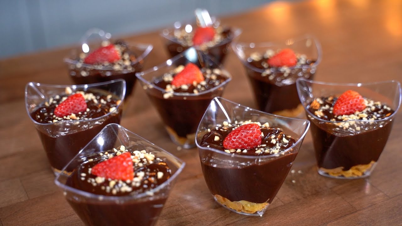 Πασπαλίζουμε από πάνω τα αλεσμένα φουντούκια και τελειώνουμε βάζοντας στο κάθε μπολάκι και από μία φράουλα.