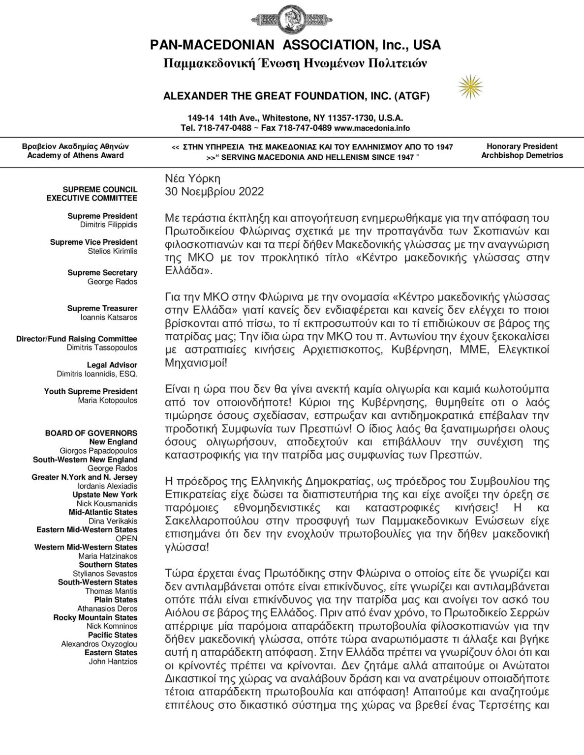 Άμεση η αντίδραση της Παμμακεδονικής Ένωσης Αμερικής στην πρωτοφανή απόφαση του πρωτοδικείου Φλώρινας να νομιμοποιήσει σωματείο το οποίο έχει ως σκοπό την διδασκαλία και την διάδοση της “μακεδονικής” γλώσσας. Κάτι που αντιστρατεύεται το ίδιο το Σύνταγμα και ανοίγει το ασκό του Αιόλου για νέα εθνικά δεινά.