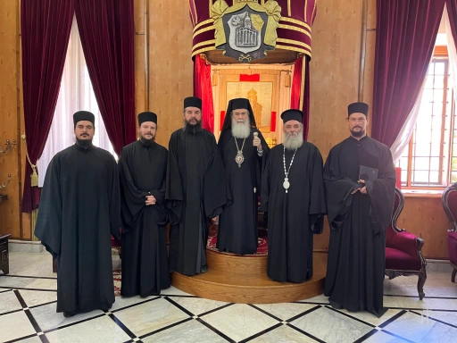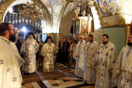 Στο δεύτερο προσκύνημα στον Τάφο της Παναγίας στην Γεσθημανή, έγινε συλλείτουργο με τον Μητροπολίτη Ελενουπόλεως Ιωακείμ του Πατριαρχείου Ιεροσολύμων, απ’ όπου και η φωτογραφία.