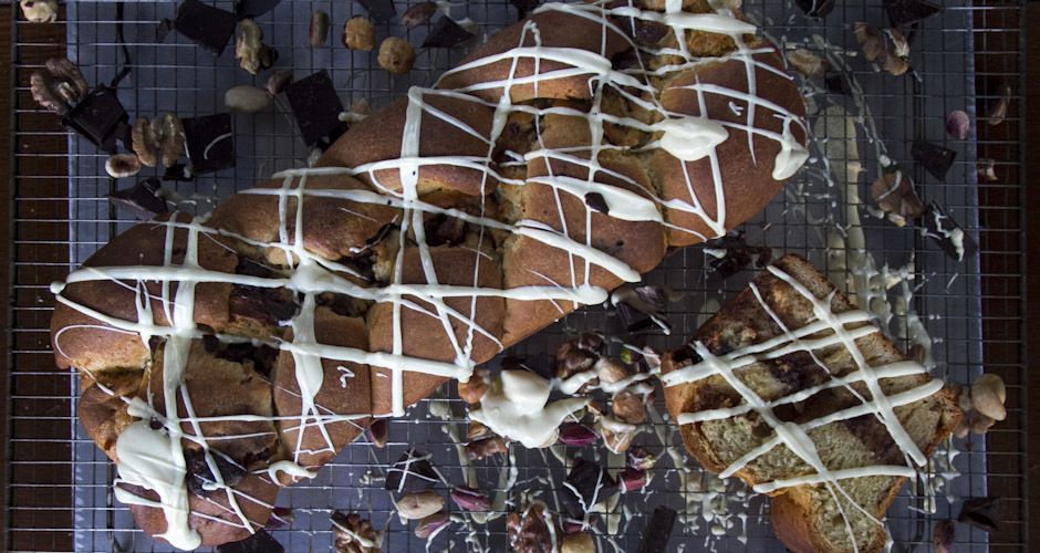 Αφαιρούμε και αν επιθυμούμε περιχύνουμε πάνω στο τσουρέκι μας λευκή κουβερτούρα (αν νηστεύουμε δεν τη βάζουμε) που έχουμε λιώσει (σε ένα μπολάκι με μεμβράνη) στα μικροκύματα στα 800 watt για 1 λεπτό ή σε μπεν μαρί.