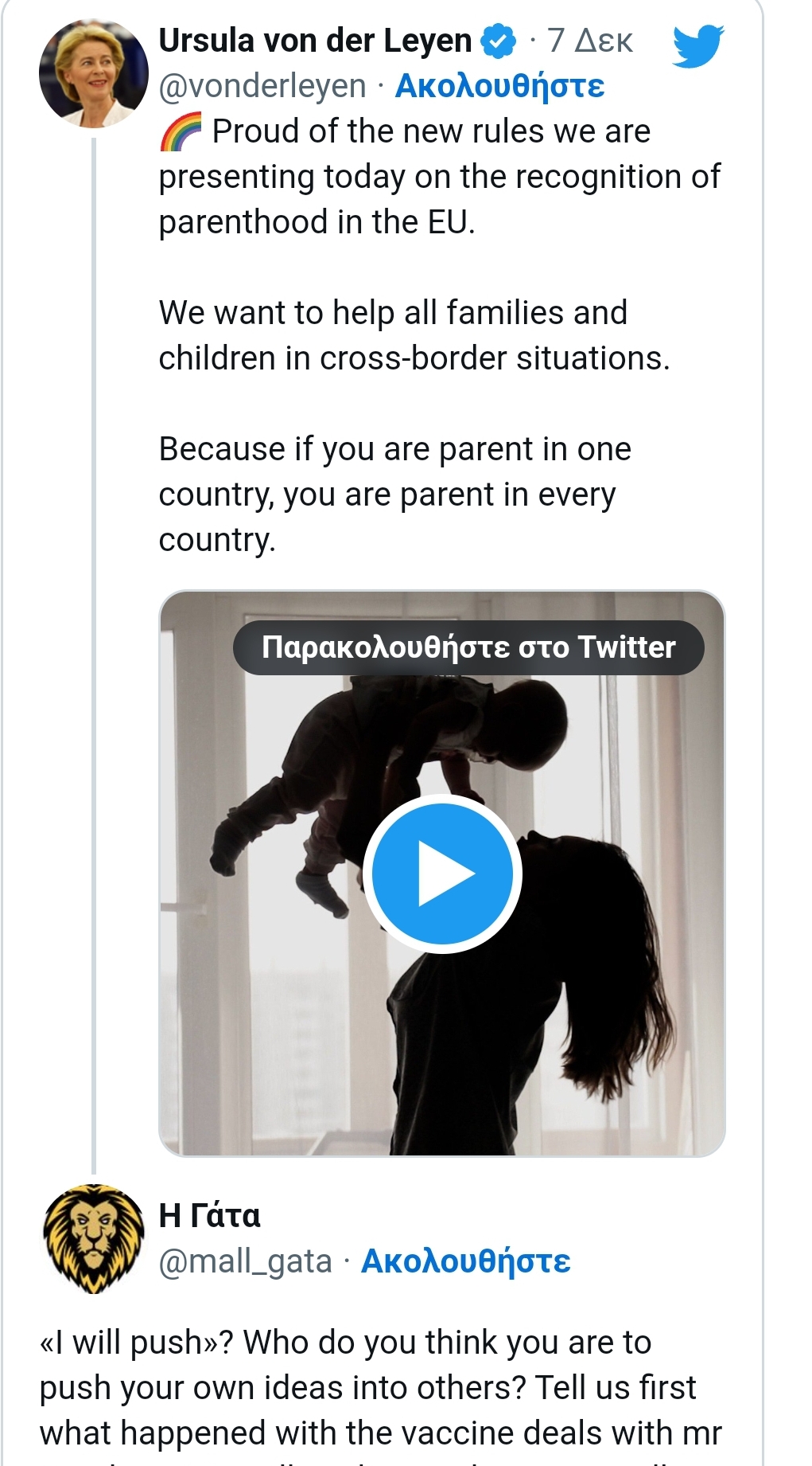 Γιατί όπως αναφέρει και στο περίεργο βίντεο που ανέβασε στο λογαριασμό της στο τουίτερ η πρόεδρος της Ευρωπαϊκής Επιτροπής Ούρσουλα φον ντερ Λάιεν, όταν είσαι γονιός σε μια χώρα, είσαι σε όλες τις χώρες. Μα ποιος ποτέ το αμφισβήτησε αυτό; Εκτός κι αν η ποιήτρια δεν εννοεί μόνο ότι θα «σπρώξει» απλά το δικαίωμα σε όλες τις χώρες, αλλά τι; Θα ανακατέψει και τις υιοθεσίες μεταξύ χωρών;