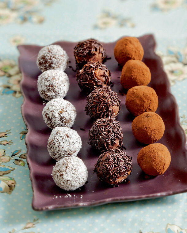 Πλάθουμε το μείγμα σε τρουφάκια και τα βουτάμε σε τρούφα ή σε καρύδα ή σε κακάο.