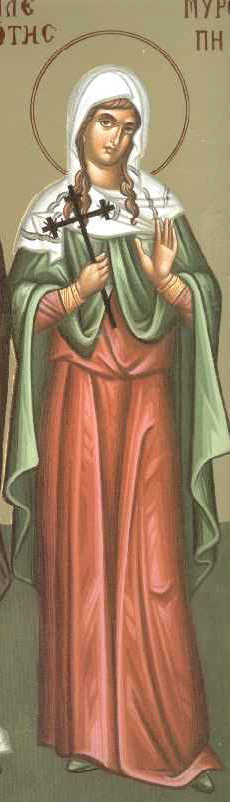 Αικισμών ταις στίγμασι, πεποικιλμένη, και βαφαίς αιμάτων σου, πεφοινιγμένη νοερώς, Χριστού εν δόξη παρίστασαι, τω θείω θρόνω, Μυρόπη αοίδιμε.