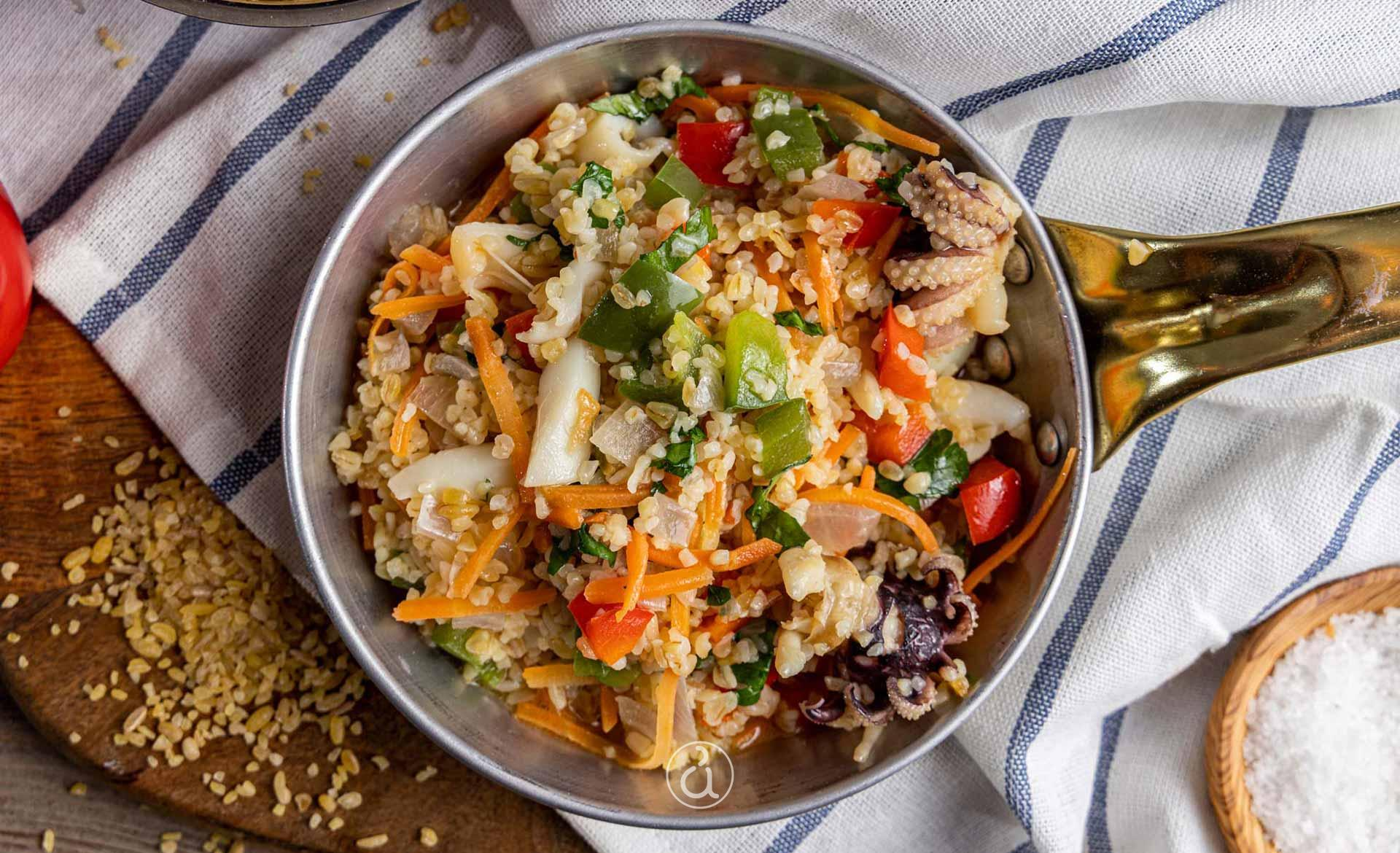 Στο νερό που έβρασαν οι σουπιές, μουλιάζουμε το πλιγούρι να μαλακώσει.