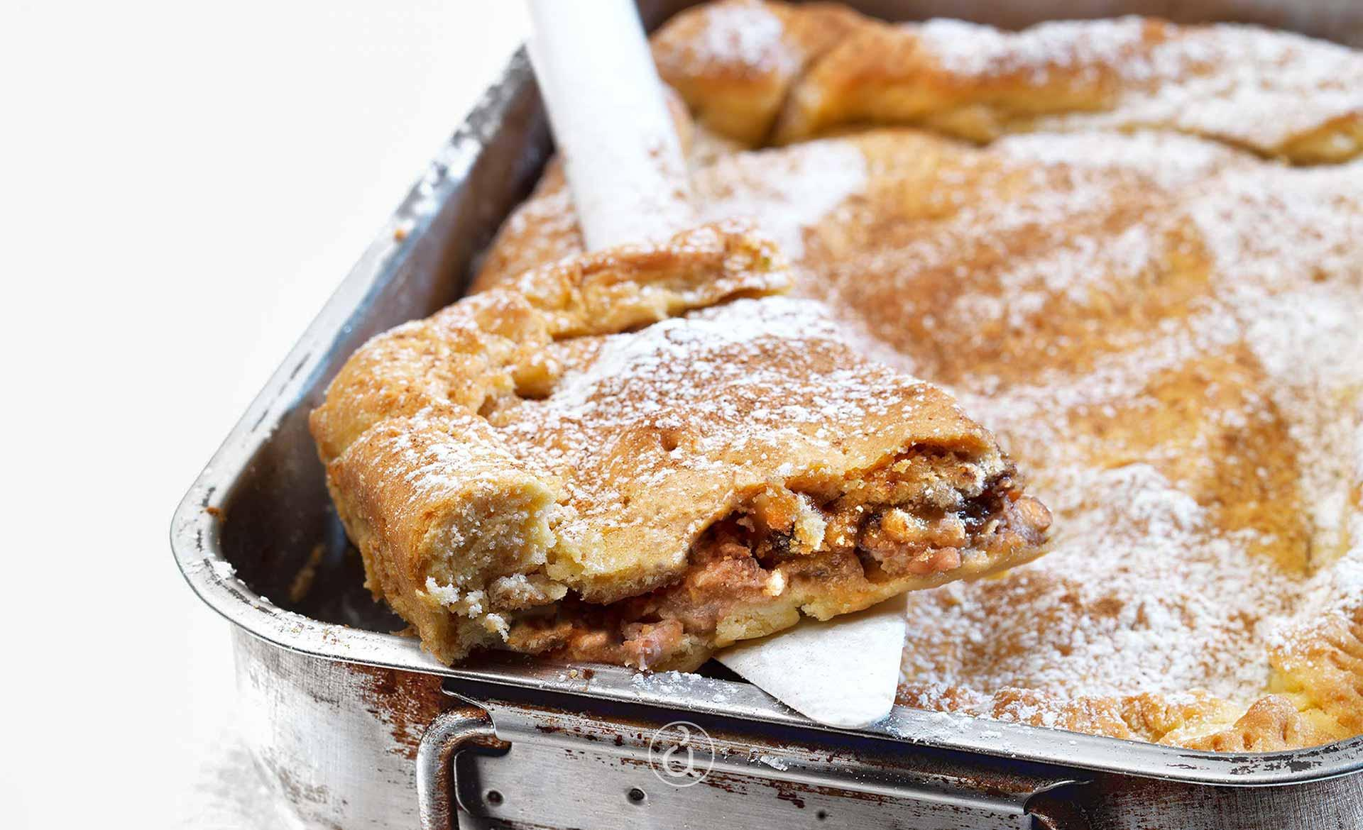 Απλώνουμε τη γέμιση μήλου στο στρωμένο φύλλο.