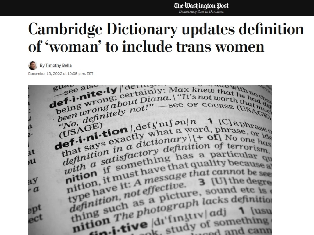 Το λεξικό του Cambridge ενημέρωσε πρόσφατα τους ορισμούς του για τη «γυναίκα» και τον «άνδρα» ώστε να συμπεριλάβει τα διεμφυλικά άτομα, διευρύνοντας επίσημα το τι σημαίνει να είσαι γυναίκα.