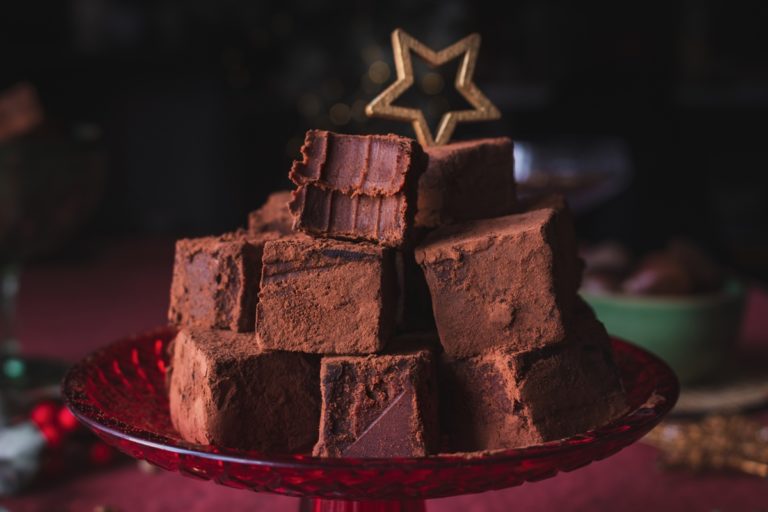 Πασπαλίζουμε αρκετό κακάο σε αντικολλητικό χαρτί και αναποδογυρίζουμε τα fudge, αφαιρούμε τη μεμβράνη και πασπαλίζουμε με κακάο.