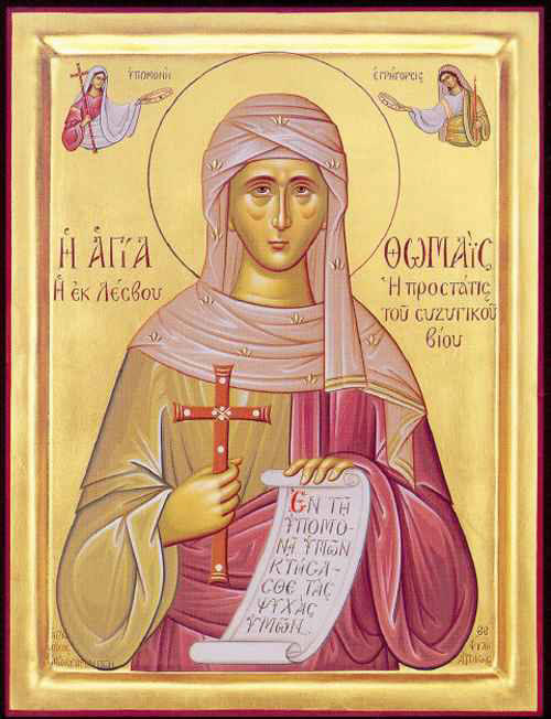 Τάς θλίψεις τοῦ βίου σου, ὡς προσφορὰν λογικήν, Χριστῷ προσενένκασα, τὴν τῶν θαυμάτων ἰσχύν, Ὁσία, ἀντείληφας. Ὅθεν ὡς συζυγίας, ὑποτύπωσιν θείαν, μέλπομεν Θωμαΐς σε, καὶ πιστῶς σοι βοῶμεν Χαῖρε τῆς νήσου Λέσβου, σεμνὸν ἐγκαλλώπισμα.