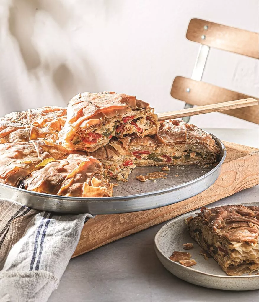Ύστερα λαδώνουμε ένα στρογγυλό πυρίμαχο σκεύος στρώνουμε μέσα ένα χωριάτικο φύλλο, το οποίο λαδώνουμε επίσης. Ακριβώς από πάνω τοποθετούμε κάθετα ένα ακόμα φύλλο δημιουργώντας έναν σταυρό, το λαδώνουμε και συνεχίζουμε με ένα άλλο λαδωμένο φύλλο. Κατόπιν απλώνουμε ομοιόμορφα πάνω στα φύλλα το μίγμα και καλύπτουμε με δύο ακόμα λαδωμένα φύλλα σε σχήμα σταυρού. Αν δούμε ότι προεξέχουν, κόβουμε λίγο τις άκρες με ένα μαχαίρι και έπειτα τις φέρνουμε προς τα μέσα.