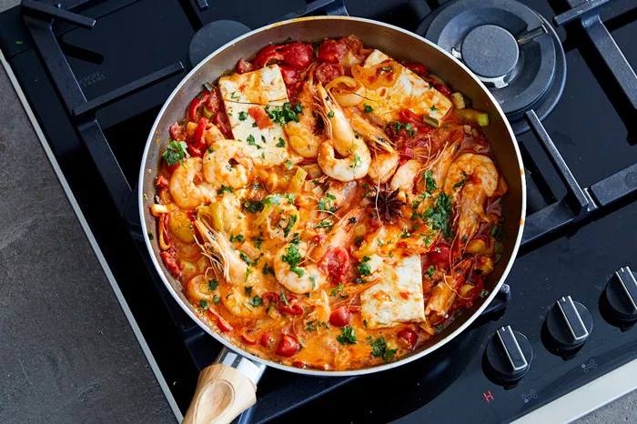 Για τα λαχανικά: Σε μεγάλο τηγάνι που πρέπει να είναι εμφανίσημο για να σερβίρετε στο τραπέζι ζεσταίνετε το λάδι σε χαμηλή ένταση και προσθέτετε τα πράσα, τα κρεμμυδάκια, τις πιπεριές, το μπούκοβο και τους αστεροειδείς γλυκάνισους. Σοτάρετε για 2 λεπτά και προσθέτετε τα κεφάλια απ’ τις γαρίδες που κρατήσατε για να δώσουν τ’ αρώματά τους. Τα αφήνετε για περίπου 10 λεπτά, ανακατεύοντας σταδιακά μέχρι να μελώσουν τα λαχανικά.