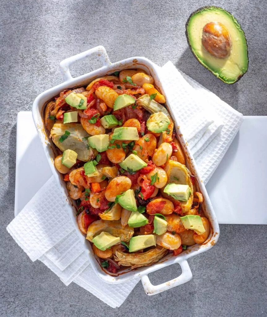 Φτιάχνουμε θρεπτική σαλάτα με γίγαντες με αγκινάρες και αβοκάντο. Συνδυάζουμε όσπρια με λαχανικά και απολαμβάνουμε.
