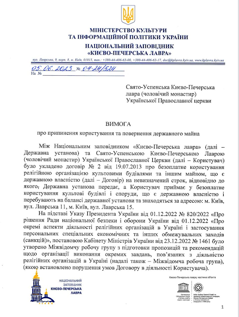 Επίσης, αναφέρει ότι σε περίπτωση που η Εκκλησία της Ουκρανίας δεν εκκενώσει την Λαύρα θα ακολουθήσει δικαστήριο το οποίο θα εκδώσει απόφαση για άρση του συμβολαίου.