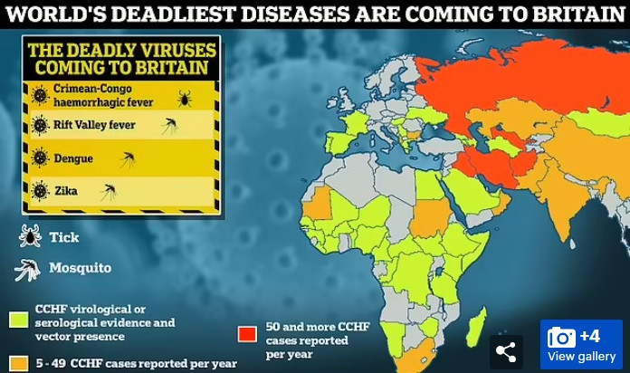 Επέστρεψε η «τρομοκρατία» που βιώσαμε επί εποχή Covid-19, καθώς Βρετανοί επιδημιολόγοι υποστηρίζουν ότι τέσσερις από τις πιο θανατηφόρες ασθένειες του κόσμου (Ζίκα, Δάγκειος, CCHF, RVF) έρχονται στη Βρετανία λόγω της κλιματικής αλλαγής.