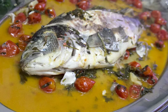 Σερβίρισμα: Το πιάτο είναι εντυπωσιακό όταν το ψάρι έρχεται ολόκληρο με τα ντοματίνια γύρω-γύρω και τη λεπτόρρευστη σάλτσα τριγύρω. Βέβαια είναι πάντα πιο πρακτικό αν το ψάρι έχει φιλεταριστεί πριν μπει στο πιάτο και ακολουθηθεί η αντίστοιχη λογική σερβιρίσματος.