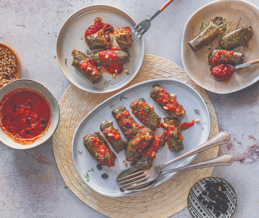 Ντολμαδάκια με εύκολη σάλτσα ντομάτας και ούζου