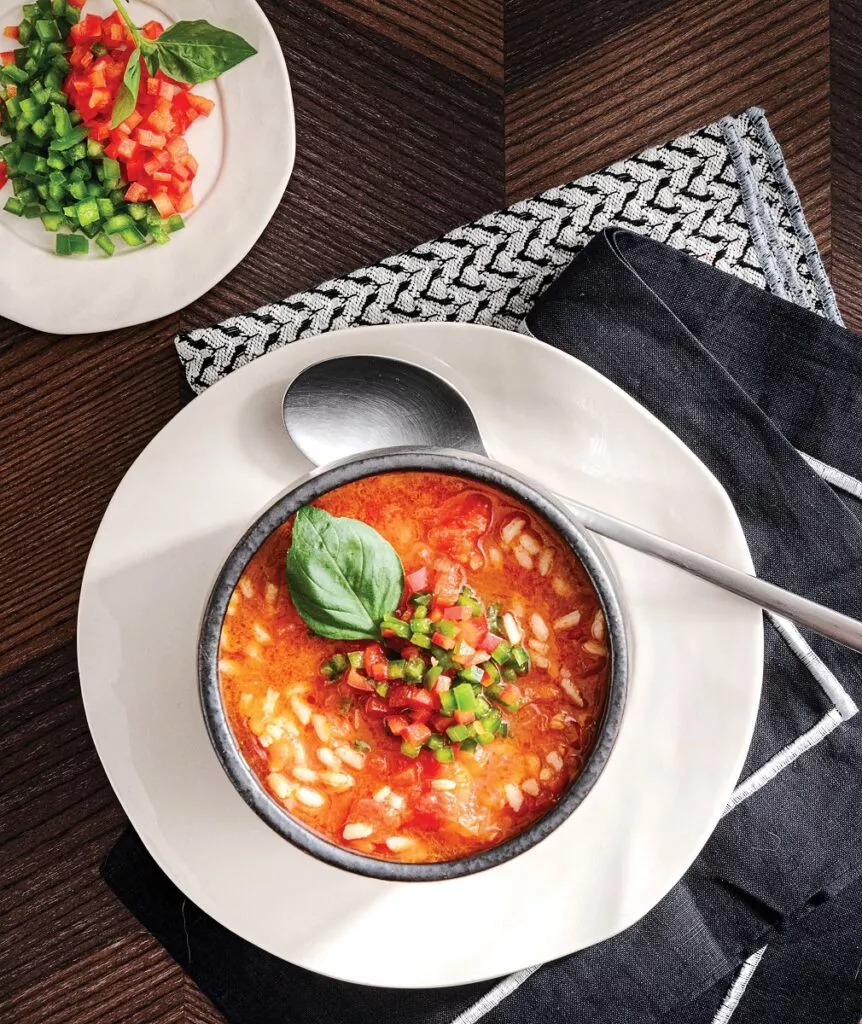 Αφήνουμε τη σούπα να σταθεί για 10΄ ακόμη και σερβίρουμε σε ζεστά πιάτα γαρνίροντας με τις ψιλοκομμένες πιπεριές και 2-3 φυλλαράκια βασιλικού.