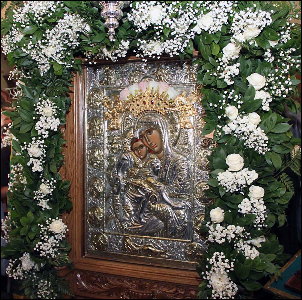 Τῇ σεπτῇ σου Εἰκόνι Γαβριὴλ ὁ Ἀρχάγγελος, καταπτὰς ἐν σχήματι ξένῳ, τὴν ᾠδήν σοι ἀνέμελψεν, Ἄξιόν ἐστιν ὡς ἀληθῶς, τὴν μόνην μακαρίζειν σε Ἁγνή, ὡς Μητέρα τοῦ τῶν ὅλων Δημιουργοῦ, καὶ σώζουσαν τοὺς κράζοντας· δόξα τοῖς θαυμασίοις σου Ἁγνή, δόξα τοῖς μεγαλείοις σου, δόξα τῇ πρὸς ἡμᾶς σου προνοίᾳ Ἄχραντε.