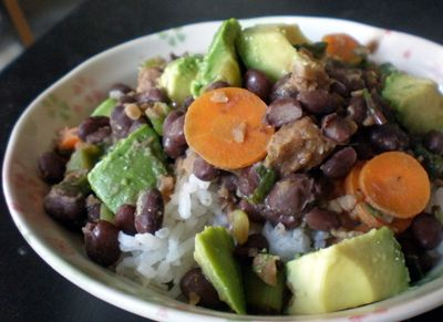 Βράζουμε το ρύζι με τα λαχανικά και το αλάτι και τα σουρώνουμε. Το ξεπλένουμε με ζεστό ή κρύο νερό, για να φύγει η κόλλα του. Καθαρίζουμε το αβοκάντο και το κόβουμε σε κύβους. Κατόπιν το ανακατεύουμε με το ρύζι. Το φαγητό είναι έτοιμο. Προαιρετικά, μπορούμε να προσθέσουμε λίγα μαυρομάτικα φασόλια.