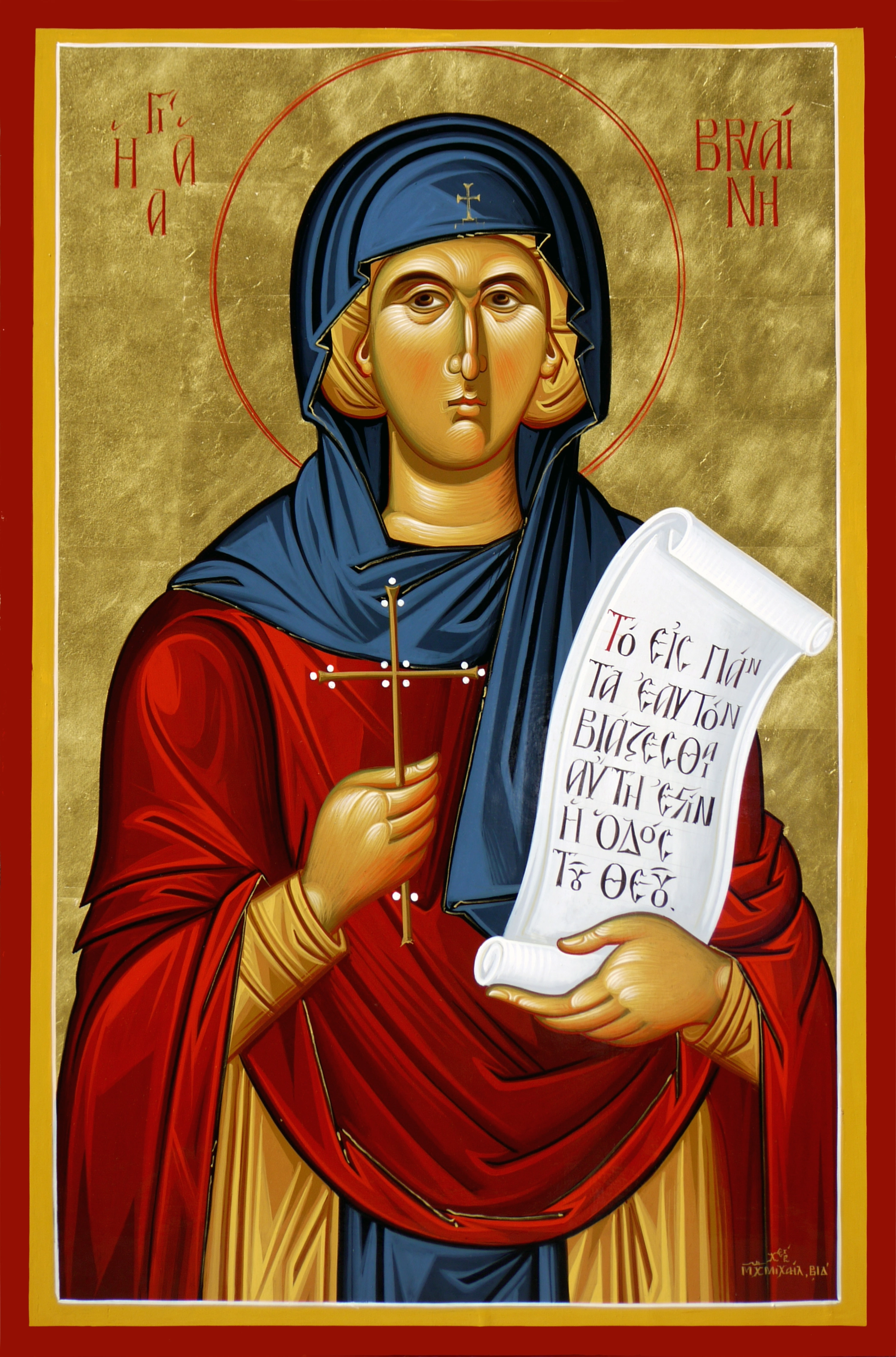 Χριστὸν τὸν δι’ ἡμᾶς, ἐκ Παρθένου Μαρίας, τεχθέντα ὑπὲρ νοῦν, ἀγαπήσασα Μῆτερ, τὰ πάντα ἐγκατέλιπες, καὶ Αὐτῷ ἠκολούθησας, καὶ ἐξήσκησας, τῶν ἀρετῶν τὴν χορείαν, ἐκ τῆς πράξεως, πρὸς θεωρίαν ἀχθεῖσα, Βρυαίνη ἀοίδιμε.